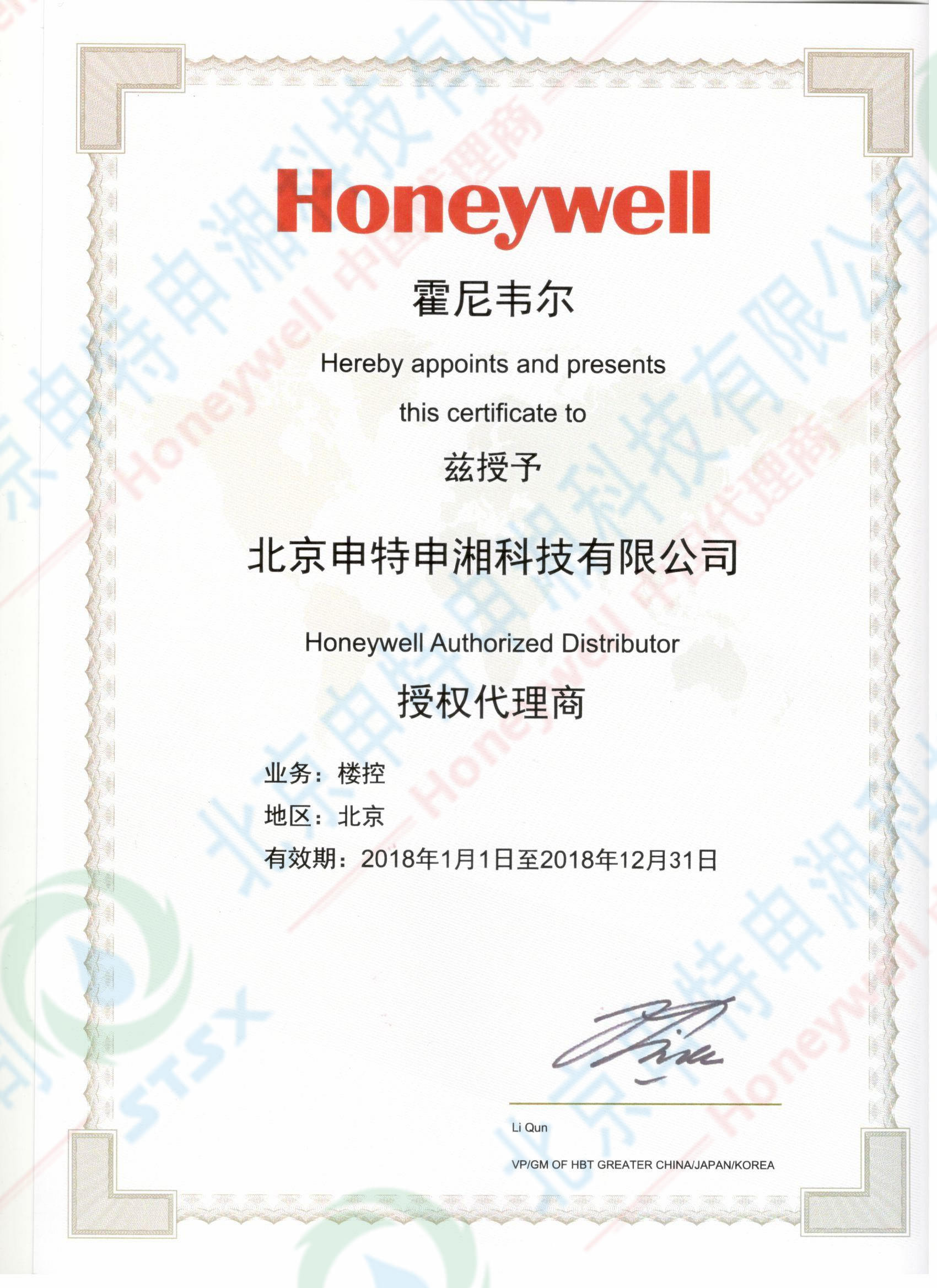 2018年霍尼韦尔授权代理商证书-北京申特申湘科技有限公司